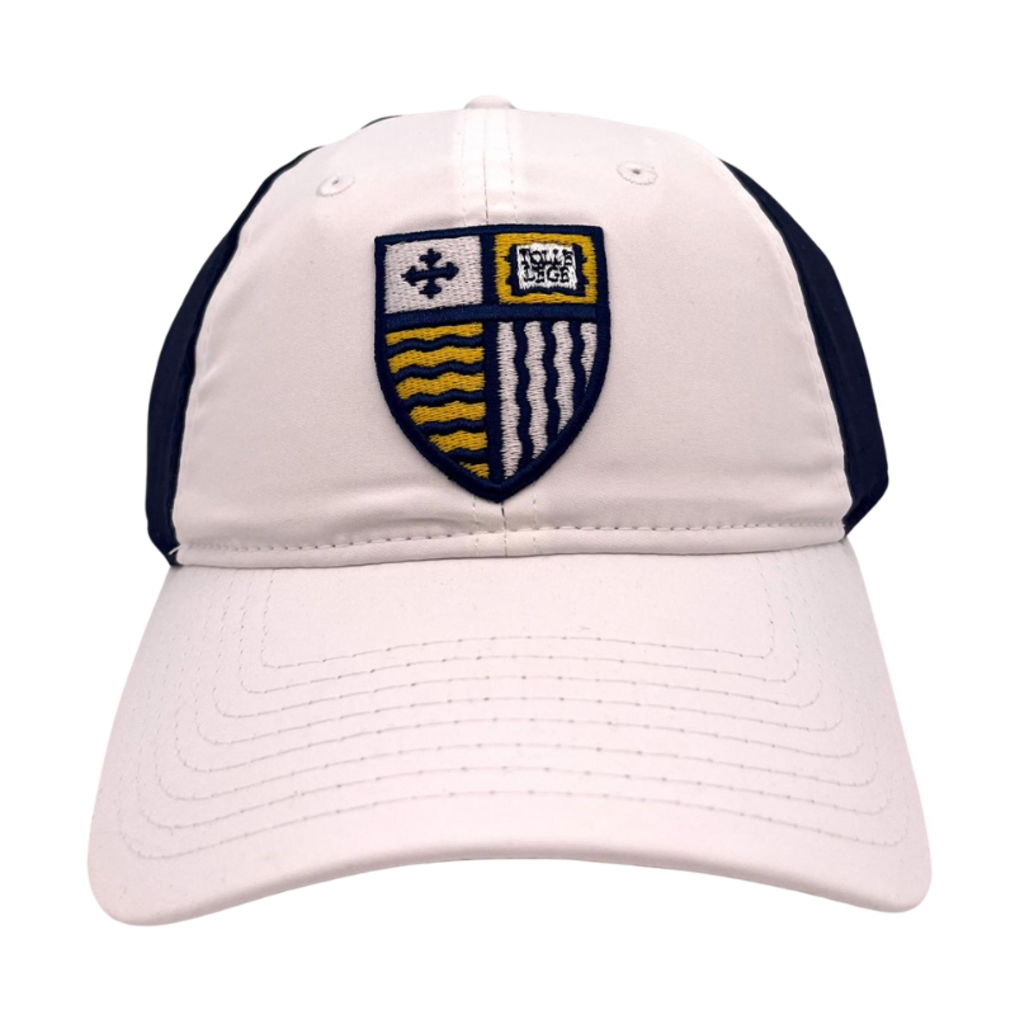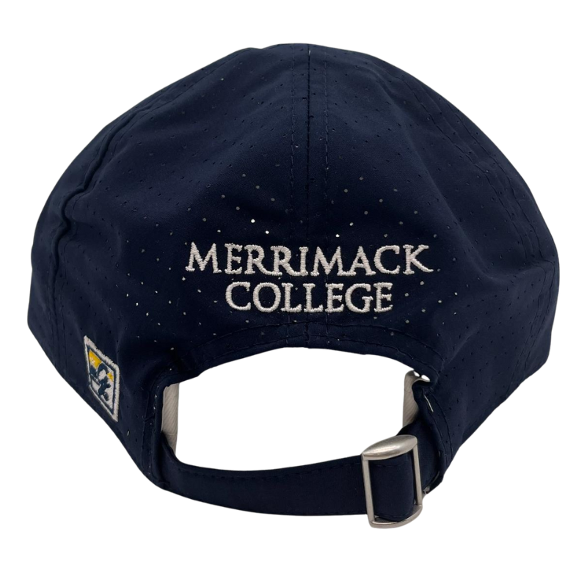 Show off that MC Warrior spirit with the iconic Merrimack shield! This hat is a two tone, white front and brim, navy cap design. The shield is embroidered and measures 1.75in wide and 2.25 long.