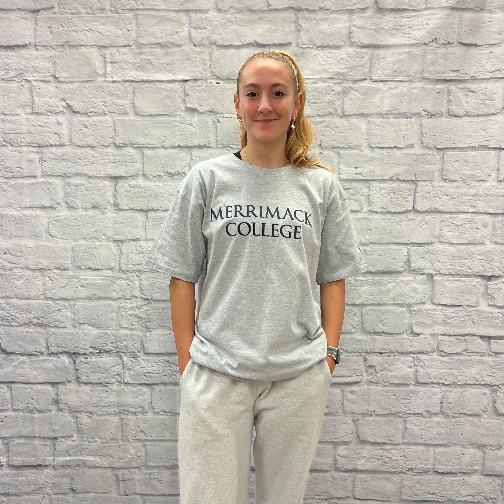 This simple but stylish Merrimack College tee shirt is a comfortable way to represent Merrimack! This Heather Grey colored tee is soft and comfortable with Merrimack College written across it in navy.