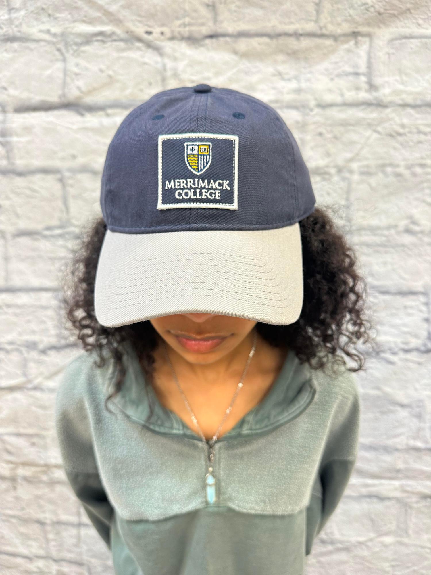 This two tone hat is a fan favorite. Navy fabric with a light grey brim. Features the Merrimack College logo on embroidered on a patch sewn on the front of cap. Perfect to sport on any rainy or sunny day to show your Warrior Pride