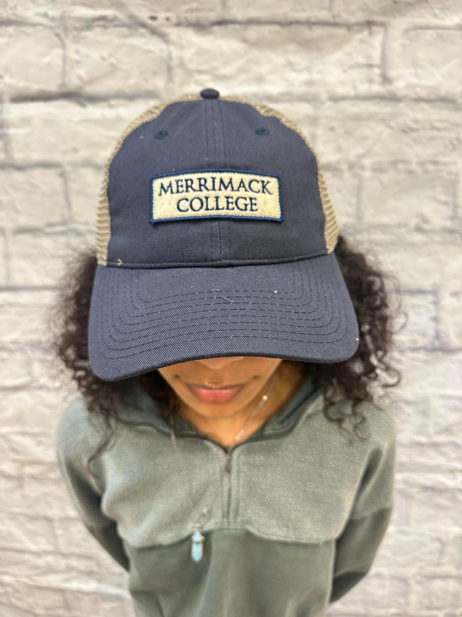 This adjustable trucker hat comes in perfectly faded navy fabric with a mesh backing that helps your scalp breath. The pre-faded fabric gives this hat a vintage look. Features the Merrimack College logo on front of cap.