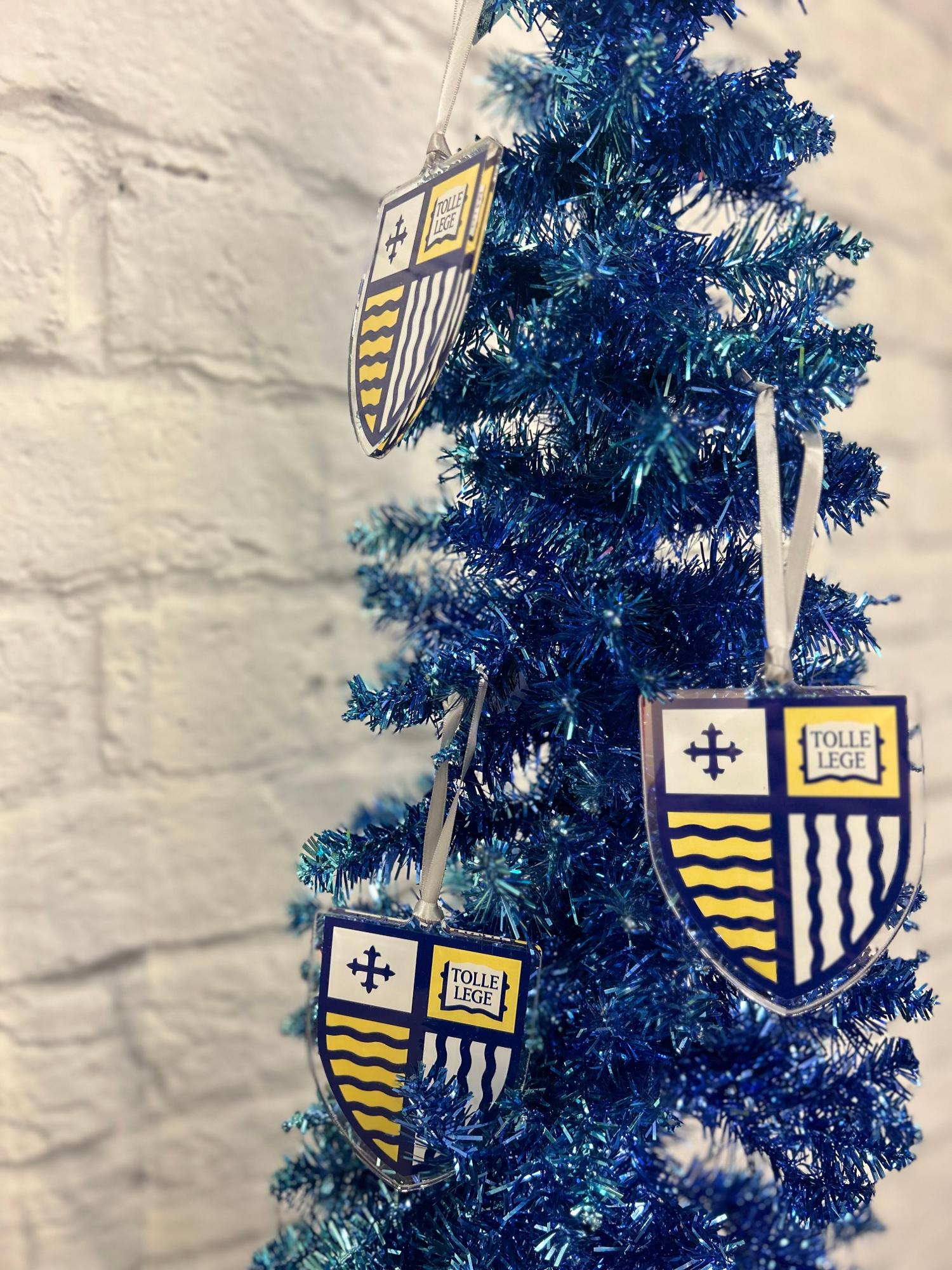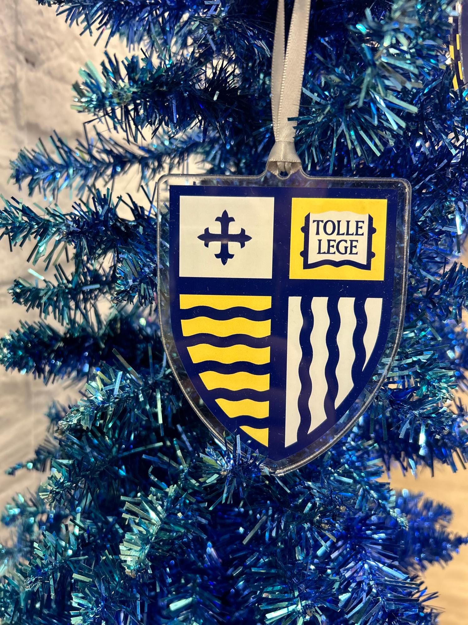 This Merrimack spirit ornament looks great on your tree or just hanging around as every day decoration. The main body of the ornament features Merrimack's shield logo with a clear background.