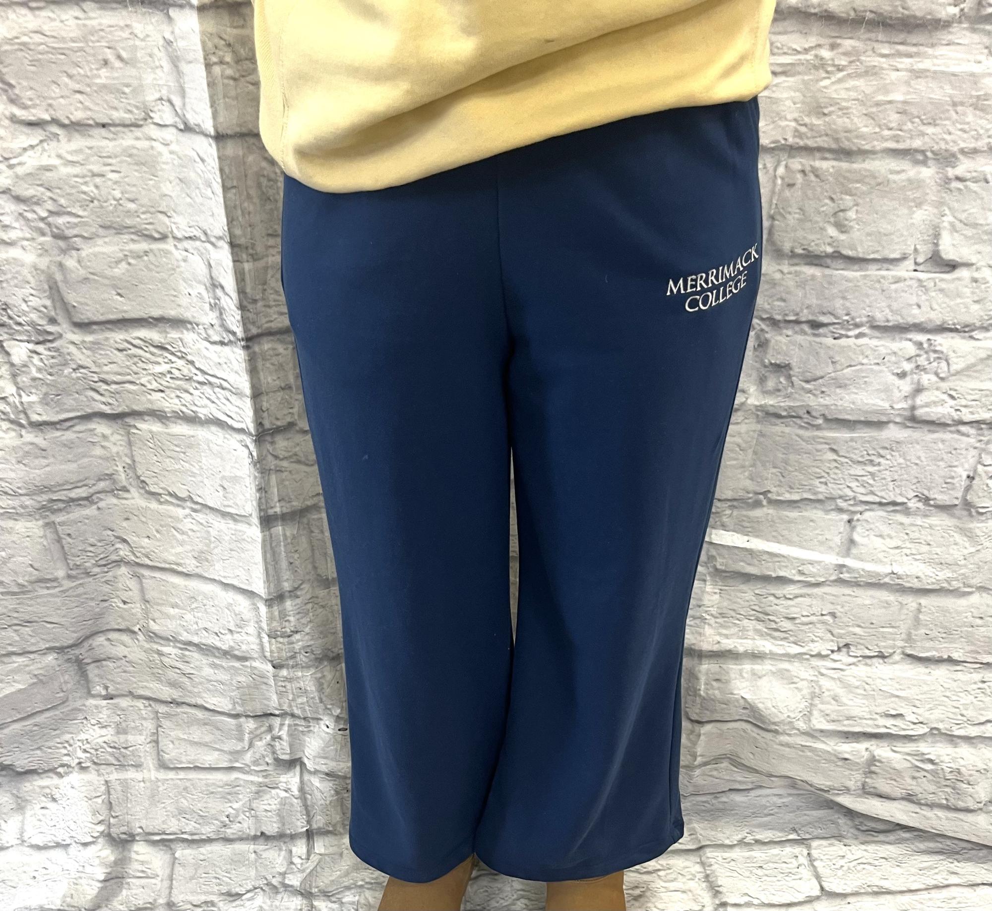 The Women's Merrimack College Vintage Navy Terry Wide Leg Pants offer a perfect blend of comfort and collegiate style, making them an ideal choice for students and parents. These pants are perfect for lounging, attending classes, or showing off your Merrimack College pride during casual outings. Their versatile design ensures they can be paired with various tops and footwear for a complete look.